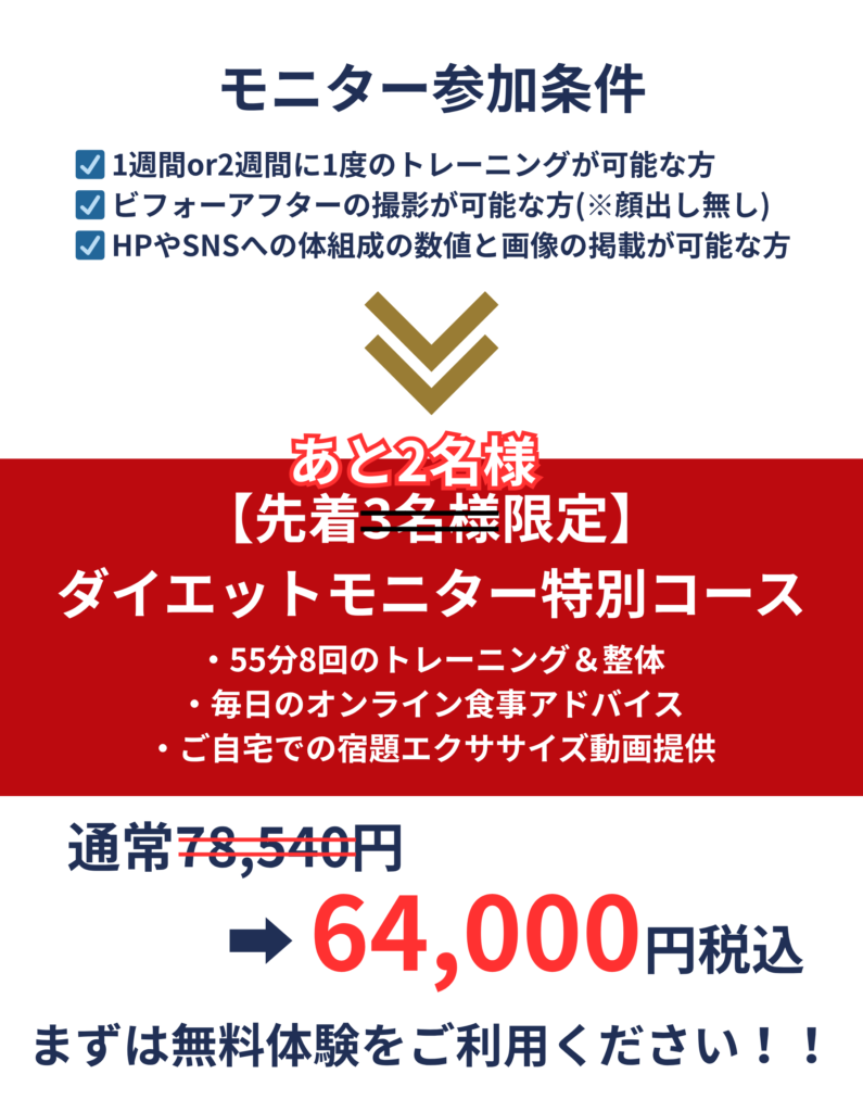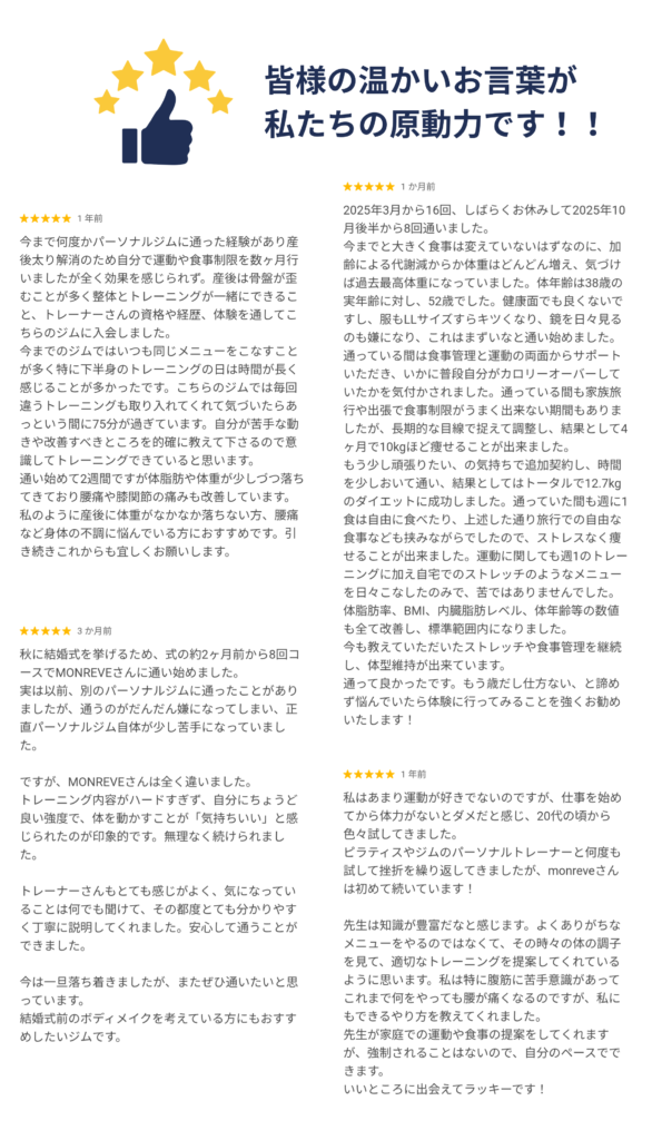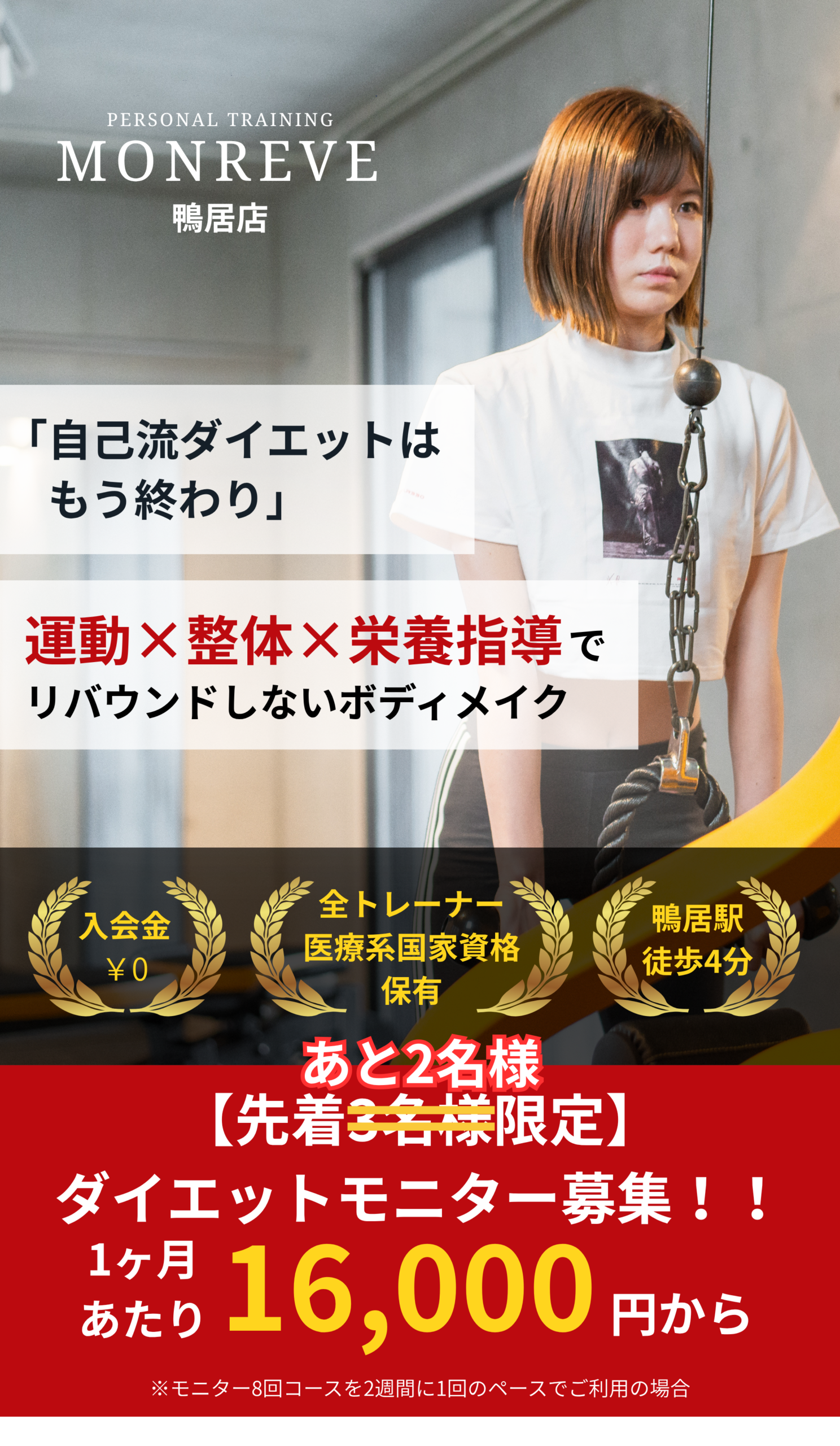 無料体験を予約する 無料体験を予約する 無料体験を予約する アクセス 完全個室パーソナルトレーニングジム MONREVE鴨居店 神奈川県横浜市都築区池辺町4364-2アムフルスB 3階JR横浜線鴨居駅徒歩4分TEL:050-8884-5069営業時間:7時~23時定休日:無し FacebookXHatenaPocketCopy